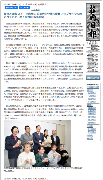東北公益文科大学の学生が、クラフト飲料など製造・販売のティーズファクトリー、月のホテルと取り組んだ「ヤタ・ジンジャーアップル」。その工程で出る副産物のリンゴを用いて鶴岡市内の福祉施設通所者が製造したパウンドケーキが完成した。